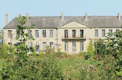 Het symmetrische stenen gebouw vertoont traditionele Franse architectuur met twee vleugels die zich uitstrekken vanaf een centraal gebouw nabij Bayeux.