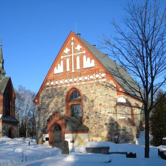 De Helsinge Church is een stenen structuur in middeleeuwse architectuurstijl in Vantaa, zuidelijk Finland. Het gebouw heeft vergrote ramen en gotische elementen en huisvest een crematorium met een urnenkamer.