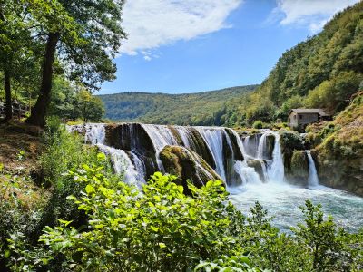 Štrbački buk is een getrapt watervallestelsel in het Una Nationaal Park dat uit verschillende natuurlijke kalksteensecties bestaat. Het water stroomt over opeenvolgende richels in poelen eronder, wat een getrapte waterval creëert die zich over de riverbedding uitstrekt.