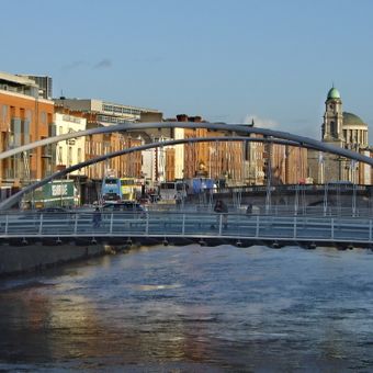 De James Joyce Brug overspant de rivier Liffey met een stalen constructie met twee symmetrische bogen die 6.5 meter boven het wegdek uitsteken.