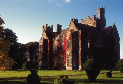 Het kasteel kenmerkt zich door stenen muren, meerdere schoorstenen, grote ramen en decoratieve elementen typerend voor Ierse landhuizen.