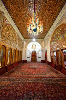 De hoofdzaal van deze Iraanse nationale erfgoedlocatie toont spiegelwerk, gipsdetails en religieuze schilderingen die Perzische kunsttradities weerspiegelen.