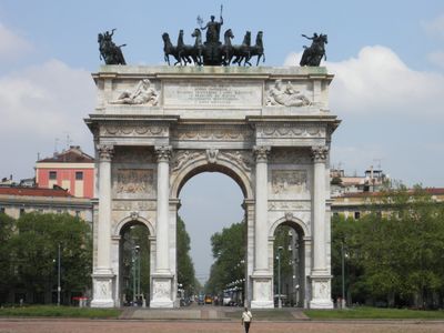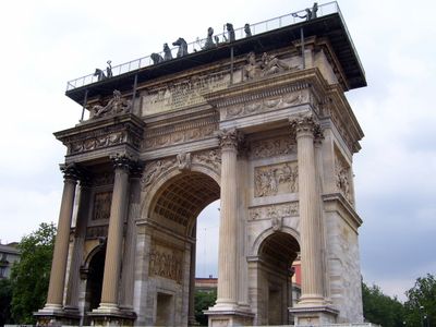 Inscriptie: ALLE SPERANZE DEL REGNO ITALICO|AUSPICE NAPOLEONE I|I MILANESI DEDICARONO DA SERVITU|FELICEMENTE RESTITUIRONO|L'ANNO MDCCCLIX|ARCHITETTO CAGNOLA