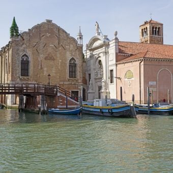 De Scuola Grande della Misericordia telt twee verdiepingen met bakstenen gevels en staat op de kruising van Rio della Sensa en Rio di Noale.
