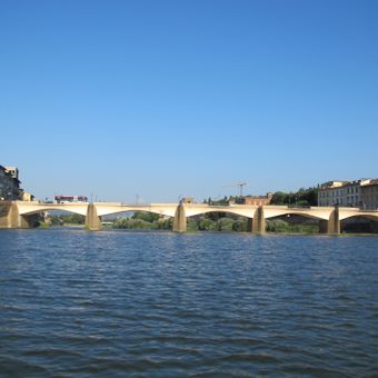De Ponte alle Grazie strekt zich 150 meter uit over de Arno met vier slanke pijlers en dunne bogen die het centrum van Florence verbinden met de Oltrarno-wijk.
