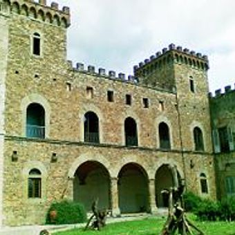 Kasteel Montalbano staat op hoger gelegen terrein met meerdere torens en verdedigingsmuren gebouwd volgens traditionele Toscaanse metselwerktechnieken.