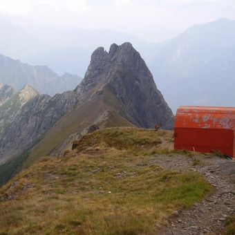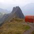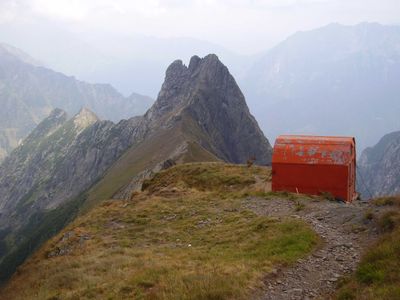 De rode metalen bivak staat op 2.250 meter hoogte op de bergkam tussen het Valsecca-dal en het Piani del Campo-dal.