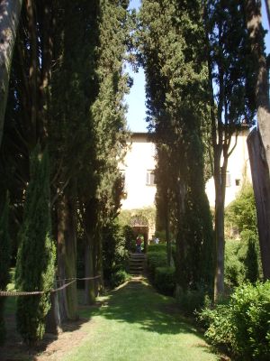 Het gebouw heeft een grijze stenen loggia versierd met sculpturen, terwijl cipressen het toegangspad naar het Renaissance-complex omzomen.