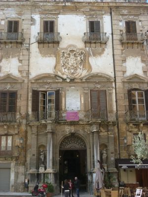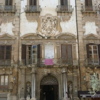 Het paleis toont een gevel met sierlijke decoraties, marmeren beelden en wapenschilden die de architectonische stijl van de Siciliaanse adel vertegenwoordigen.