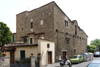 Het gebouw vertoont zandstenen muren en een torenstructuur, wat de architectonische kenmerken van vroege Florentijnse woongebouwen weerspiegelt.