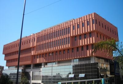 Het gebouw heeft een omgekeerde piramidestructuur van beton en staal, specifiek ontworpen om bestand te zijn tegen seismische activiteit in de regio.