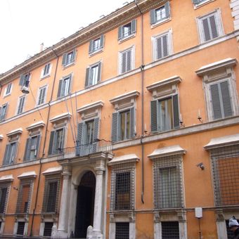 Palazzo Giustiniani is een regeringsgebouw bij het Pantheon in Rome dat nu administratieve kantoren van de Italiaanse Senaat herbergt. De stenen gevel toont een portaal met zuilen en een balkon erboven, terwijl ramen zijn verdeeld over drie verdiepingen.