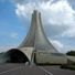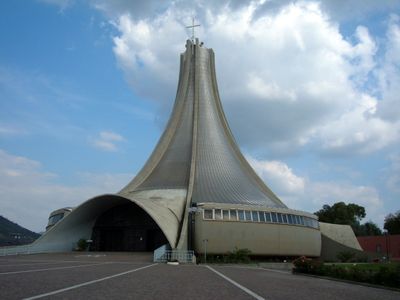 Het heiligdom heeft een cirkelvormige plattegrond met een omgekeerd trechtervormig gewelf en glazen deuren die de Passie van Christus uitbeelden.