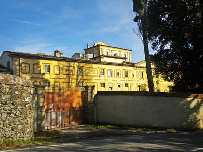 De villa strekt zich uit over 18 hectare parkland met uitzicht op de Apennijnen en beschikt over twee buitenzwembaden en een complete spa-faciliteit.