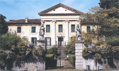 De villa toont vier Ionische halfzuilen die een groot fronton ondersteunen, met een trap versierd met beelden van wit Costozza-steen.