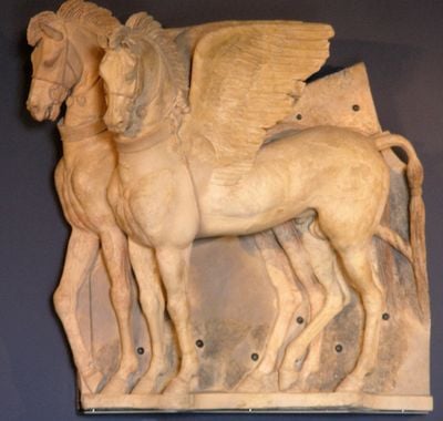 Wat opvalt is hoe de paarden uit het paneeloppervlak tevoorschijn komen en geleidelijk overgaan van plat relief naar volledig driedimensionale vorm. Deze techniek toont hoe Etruskische kunstenaars de grens tussen reliëf en vrijstaand beeld vervagden terwijl ze de ingewikkelde details van de vleugels en koppen uitwerkten.