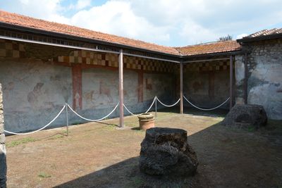 Bezoekers bereiken het huis in Regio V Insula 4 via een zijstraat van de Via di Nola om de Romeinse architectuur te onderzoeken.