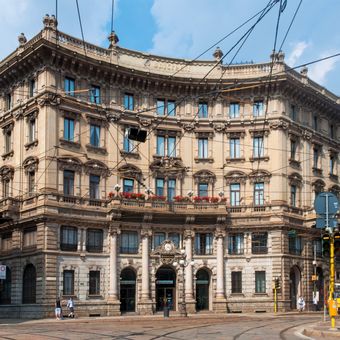 Architect Luigi Broggi voltooide dit financiële gebouw in 1902 tijdens een periode van uitgebreide stedelijke ontwikkeling en modernisering in Milaan.