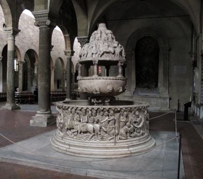 Baptismal font of San Frediano, Romaans doopvont in de Basiliek van San Frediano, Lucca, Italië.