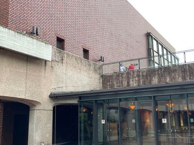 De buitengevel toont karakteristieke betonelementen in de naoorlogse moderne stijl die typisch was voor Japanse cultuurgebouwen in de jaren zeventig. Bij binnenkomst vinden bezoekers een open hal met hoog plafond die dient als ontmoetingspunt en oriëntatiepunt.