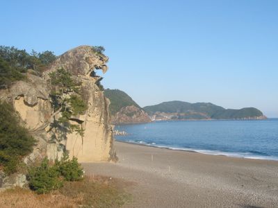 Shichiri Mihama Beach strekt zich uit langs een ruime kust en behoort tot de langste zand- en grindstranden van het land. Dit kustlijn vertoont ongewone geologische formaties die sedimentlagen tonen die elders zelden zichtbaar zijn.