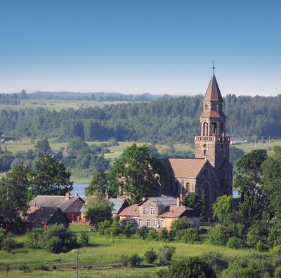 Gelegen op de route tussen Daugavpils en Aglona, verwelkomt de kerk bezoekers nabij twee meren en de rivier Dubna.