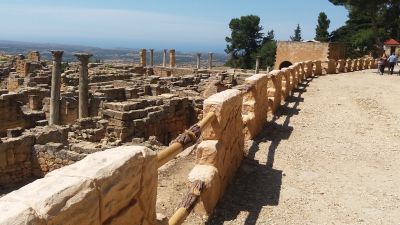 De archeologische vindplaats strekt zich uit over een plateau met uitzicht op de Middellandse Zee, met tempels, theaters, openbare baden en necropolen.