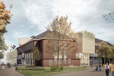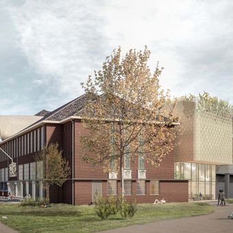 De goudkleurige gevel van het gebouw, ontworpen om op enveloppen te lijken, bevat een uitstekend raam genaamd 'Duikbril' dat uitzicht biedt op Venlo zonder toegangskaart.