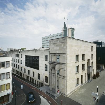Architect Frits Peutz voltooide de bouw van dit administratief centrum in 1942, tijdens de periode van de Tweede Wereldoorlog.