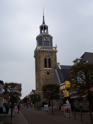 De stenen kerk staat met zijn puntige toren en grote ramen, met traditionele Nederlandse architectuurelementen uit de 17e eeuw.