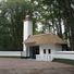 Een houten brug bij de ingang leidde bezoekers naar een restaurant met terras dat uitkeek op zwanen in het aangrenzende water. Deze rustige plek bood een vredig plekje om uit te rusten terwijl je de vogels bekeek.