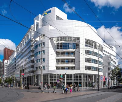 Het witte staal-, beton- en glasgebouw strekt zich 243 meter uit langs het Spui, met een centraal atrium van 50 meter hoog.