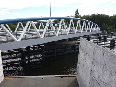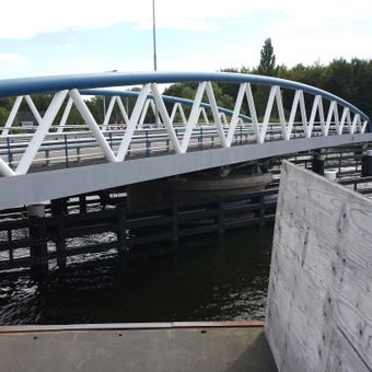 De Schipholdraaibrug draait horizontaal op een centraal draaipunt om doorgang van schepen mogelijk te maken op de waterweg tussen Schiphol en Amstelveen.
