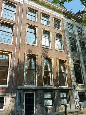Huis met gevel onder gebeeldhouwde zandstenen verhoogde lijst met opzetstuk