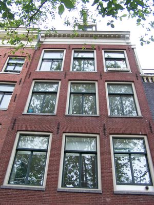 Pand met vijfraamsgevel onder door de vensters doorbroken rechte lijst met twee consoles