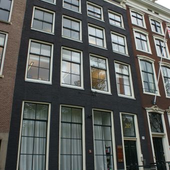 Pand met vierraamsgevel onder rechte lijst met consoles, triglyfen en attiek zeven louis, Rijksmonument op Keizersgracht 205