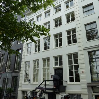 Pand met vijf vensters brede zandstenen gevel met hoeklisenen en triglyfenlijst, Rijksmonument op Amstel 222