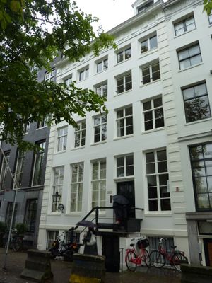 Pand met zandstenen gevel onder rijk gebeeldhouwde in het midden verhoogde lijst met consoles enz