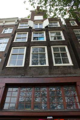 Huis waarvan de gevel, die zijn bekroning heeft verloren, een provisorische afsluiting heeft