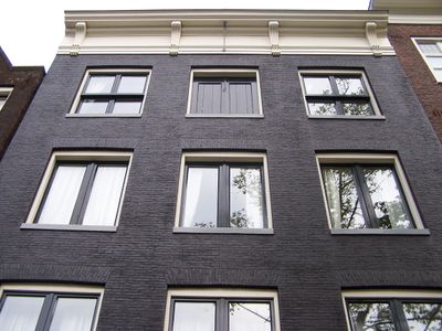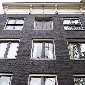 Pand met gevel onder rechte lijst met consoles en schilddakje, Rijksmonument op Bloemgracht 131