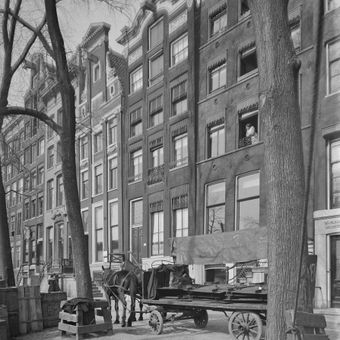 Pand met zandstenen gevel onder rijk gebeeldhouwde verhoogde lijst en attiek, met gebeeldhouwde stoep, pui en middenpartij