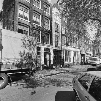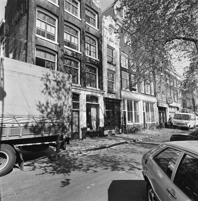 Pand met zeer smalle zandstenen lisenengevel onder gebeeldhouwde gebogen beëindiging, Rijksmonument op Kloveniersburgwal 26