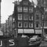 Hoekhuis met gevel onder rechte stenen lijst met consoles waarop een verhoging