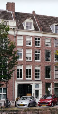 Pand met gevel onder rechte lijst waarop dakkapel met snijwerk, Rijksmonument op Nieuwe Herengracht 51, Amsterdam