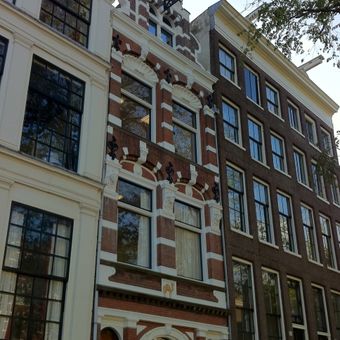 Pand met gepleisterde gevel met pilasterorden per verdieping en een top in overgang van het twee-trappensysteem naar de hals van het vingboonstype