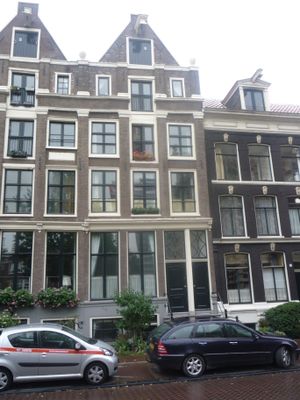 Pand met gevel onder rechte lijst met goede late roedenverdeling op de verdiepingen