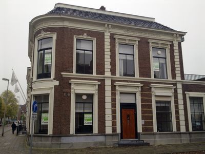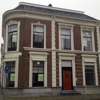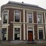 Hoekpand van twee bouwlagen opgetrokken uit baksteen op natuurstenen plint en gedekt door een met platte Friese pannen belegd afgeknot schilddak