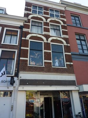 Pand met bakstenen gevel met rechte kroonlijst. Oorspronkelijk twee gevels, onderpui in 1938 vernieuwd. Terracotta Heilige beeld en d.g.l. moderne toevoegingen