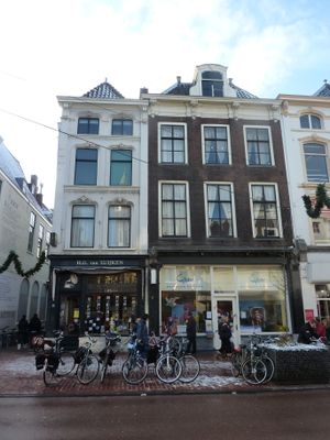 Hoekhuis Lange Pieterskerkkoorsteeg. Twee gevelstenen met leeuwenmaskers en opschriften "Die lijdt en siet, doet haet te niet. Beter benyt dan beclacht, alst Godt behacht". Rechte kroonlijst