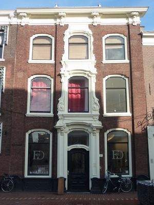 Pand met bakstenen gevel met rechte consoles, kroonlijst, mooie onderpui met hardstenen plint, rijkbewerkte middenpartij, building in Leiden, Netherlands